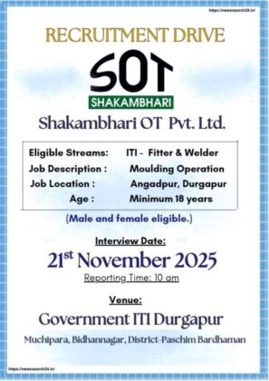 দুর্গাপুর শিল্পাঞ্চলে কর্মসংস্থানের নতুন সুযোগ নিয়ে এসেছে Shakambhari OT Pvt. Ltd. সংস্থা। ITI উত্তীর্ণ যুব-যুবতীদের জন্য সংস্থার পক্ষ থেকে Recruitment Drive 2025 আয়োজন করা হচ্ছে। সংক্ষিপ্তভাবে নিয়োগ সংক্রান্ত সমস্ত তথ্য নিচে তুলে ধরা হলো—