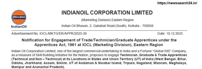 IOCL Recruitment 2025 : ইন্ডিয়ান অয়েল কর্পোরেশন লিমিটেড (IOCL)–এর Eastern Region (ER) থেকে Apprentice Recruitment 2025–এর অফিসিয়াল বিজ্ঞপ্তি প্রকাশিত হয়েছে। Apprentices Act, 1961 অনুযায়ী Technician, Trade ও Graduate Apprentice পদের জন্য এই নিয়োগ করা হবে। আবেদন প্রক্রিয়া শুরু হয়েছে এবং চলবে ৩১ ডিসেম্বর ২০২৫ পর্যন্ত।
